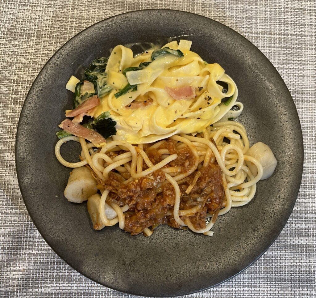2種のパスタ トリュフオイル香るカルボナーラ&粗挽き肉のボロネーゼ風