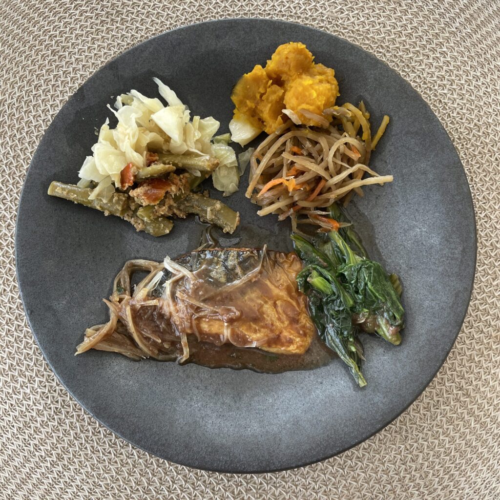 副菜はキャベツとしらすの和え物・いんげんしめじのドライトマト胡麻和え・かぼちゃの煮付けときんぴらごぼう
