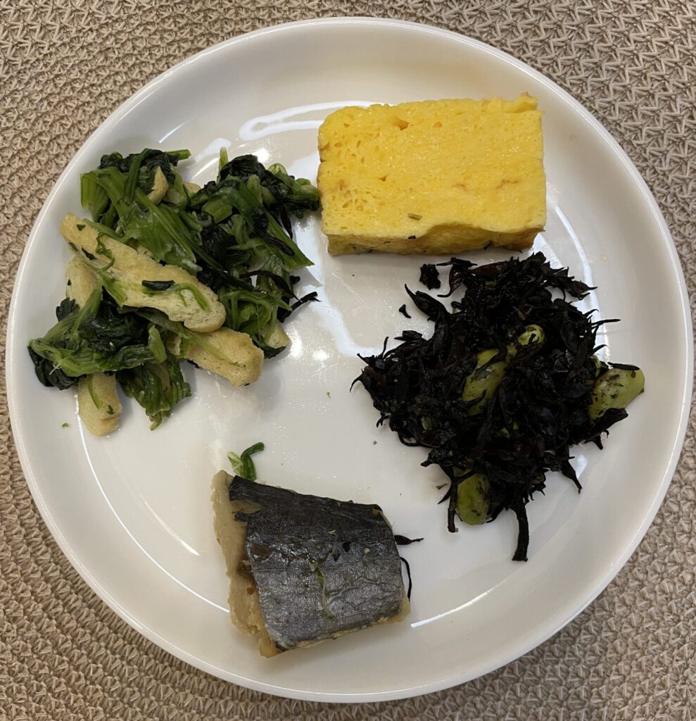 ほうれんそうと油揚げの煮物はうす味です。すき焼きが濃いめの味なので、この優しいお出汁の味がとても良く、私は副菜の中でこれが一番好きなおかずでした。