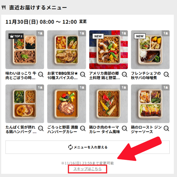 ログイン後のメニュー画の面次回お届け予定の下にある「スキップはこちら」を選択